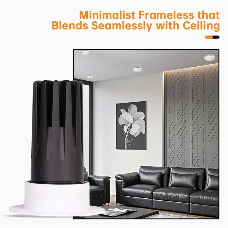 This Trimless Recessed Spotlight transforms spatial lighting with its sleek design, blending seamlessly into the ceiling. Its body is made of die-cast aluminum and PMMA, with a heat-dissipating structure optimized for quick cooling. Paired with a highly integrated COB chip, it uses less power while still delivering professional-level color rendering (Ra≥90) and precise light color control (SDCM≤3).